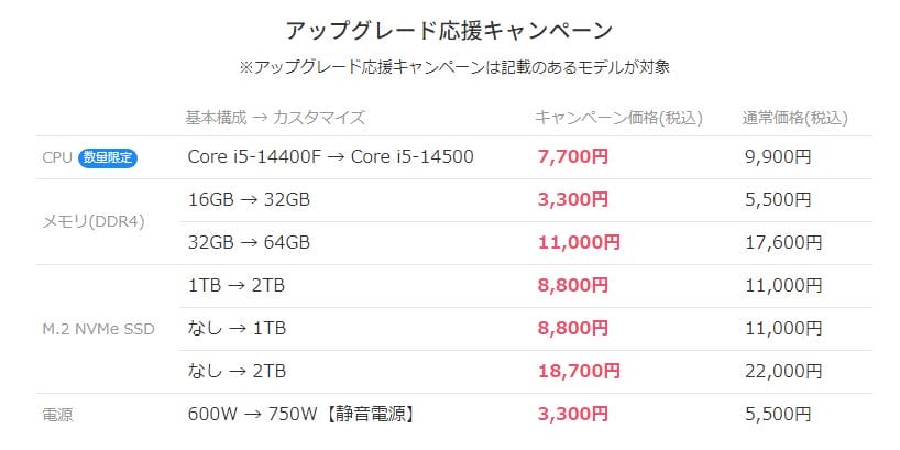 なお、一部のモデルはメモリ増設&SSD&電源カスタマイズの割引キャンペーン対象となっています。