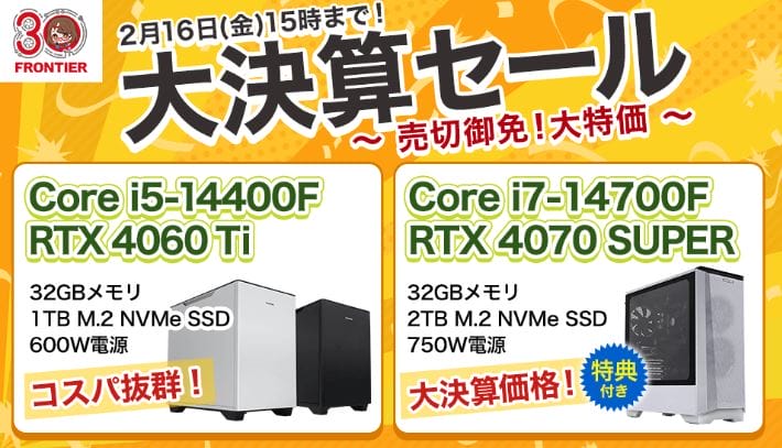 RTX 4070 SUPER搭載ゲーミングPCが初登場!フロンティア『30周年記念SALE 第4弾』開催