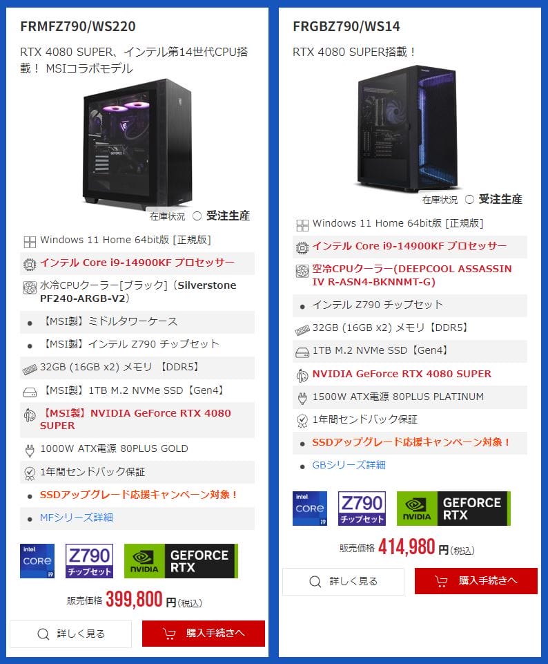 特に最新グラボの『RTX 4080 SUPER』や『RTX 4070Ti SUPER』『RTX 4070 SUPER』を搭載したモデルが用意されている点は必見!