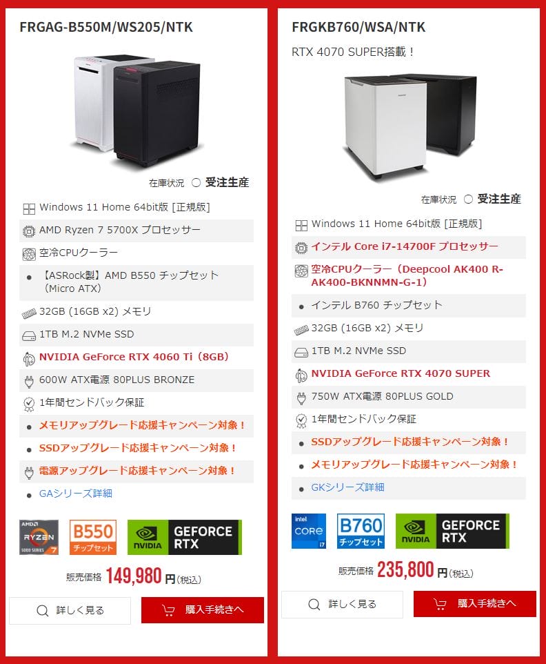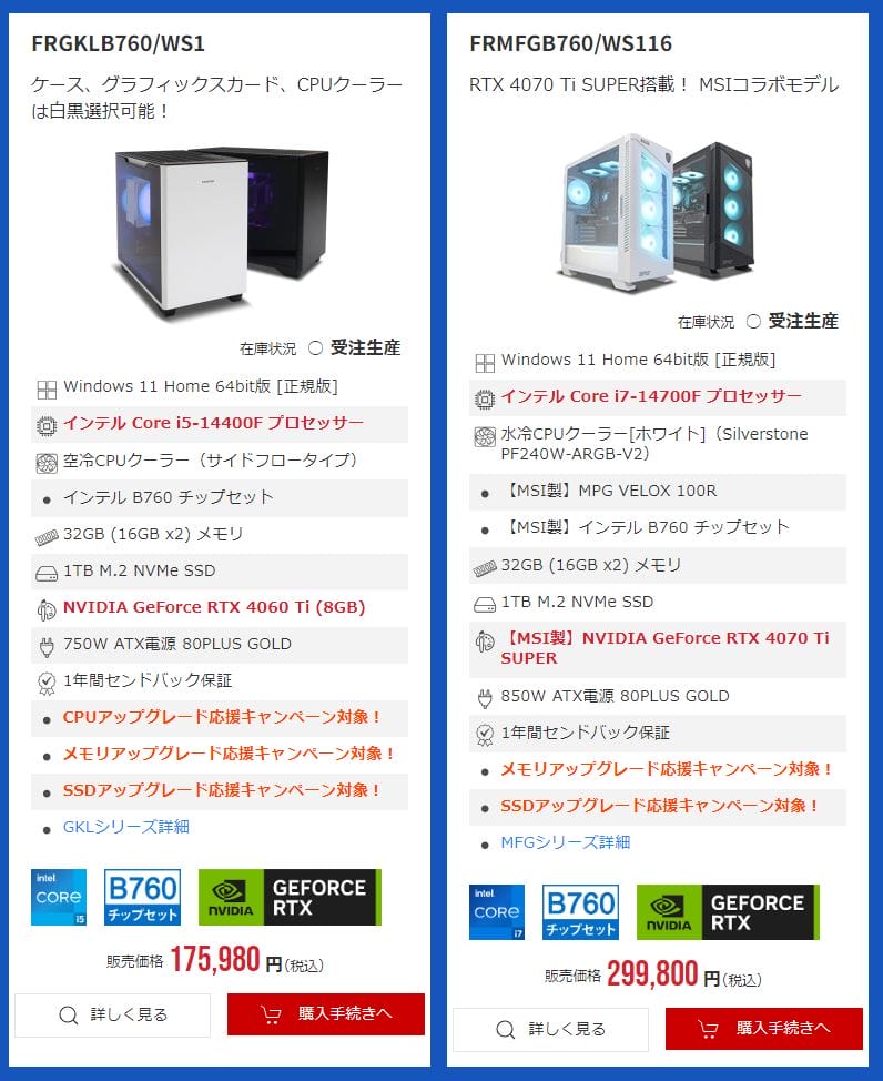同じく最新グラボである『GeForce RTX 4070Ti SUPER』や『GeForce RTX 4070 SUPER』搭載モデルもラインナップに含まれています。