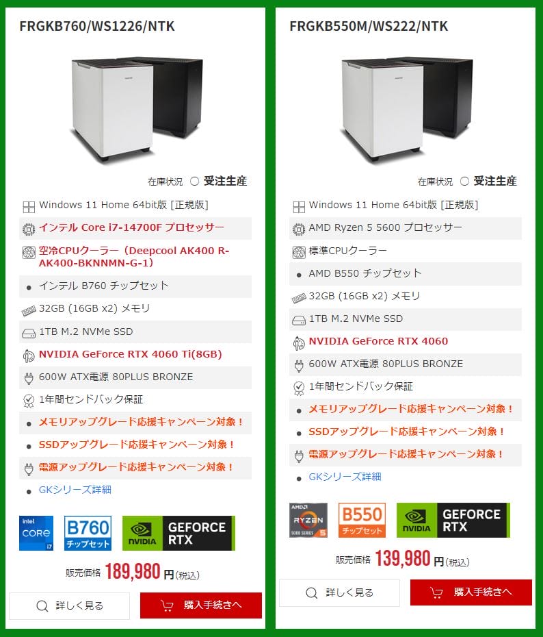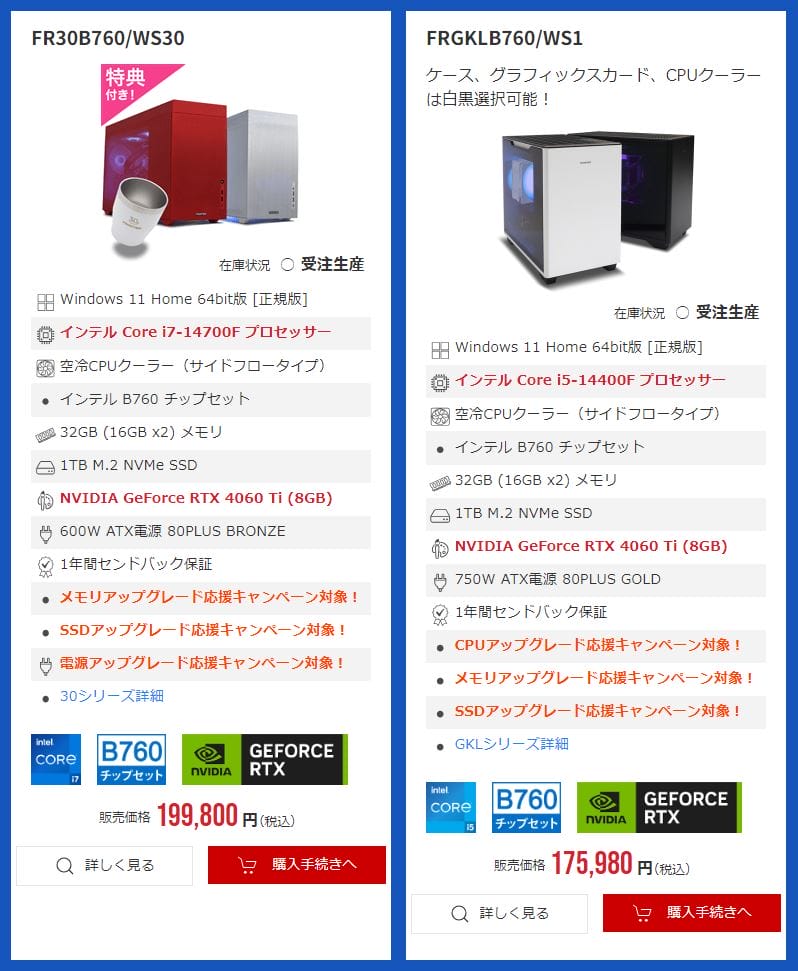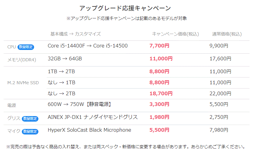 なお、一部のモデルはメモリ増設&SSD&電源カスタマイズの割引キャンペーン対象となっています。グリスやマイクを割引価格で追加できる特典もアリ。