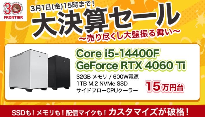 RTX 4070Ti SUPER搭載ゲーミングPCが大特価!フロンティア『30周年記念SALE FINAL』開催