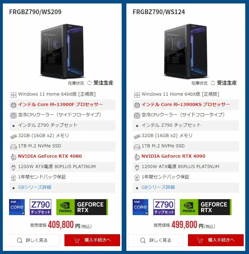 ▼インテル第13世代CPU搭載PCが特価で販売!最上級グラボのRTX4090およびRTX4080搭載モデルも用意されています。