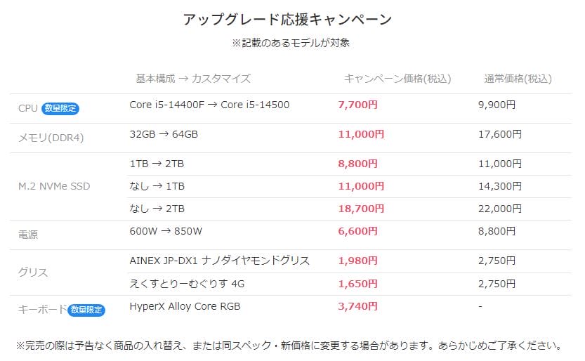 なお、一部のモデルはメモリ増設、SSD、電源カスタマイズ等の割引キャンペーン対象となっています。グリスやマイクを割引価格で追加できる特典もアリ。