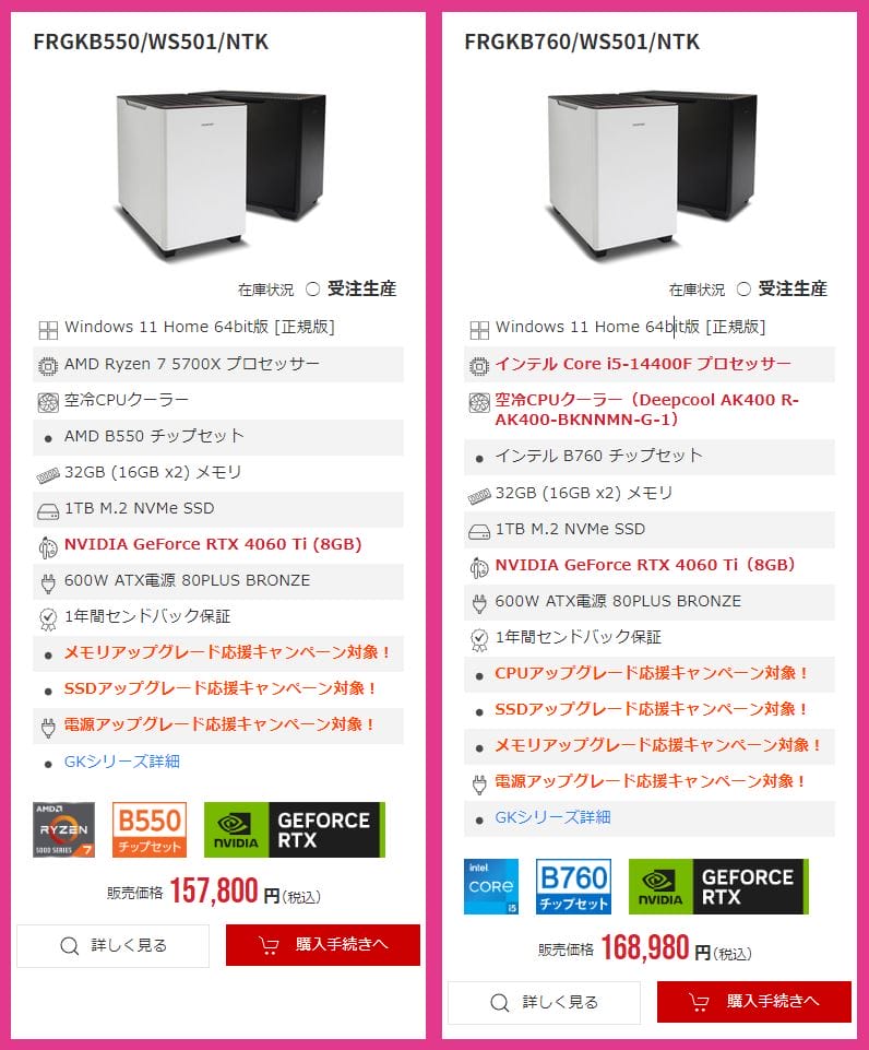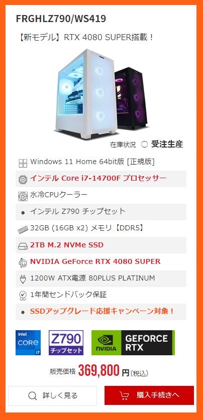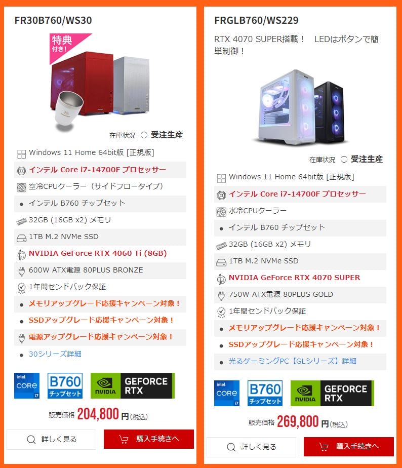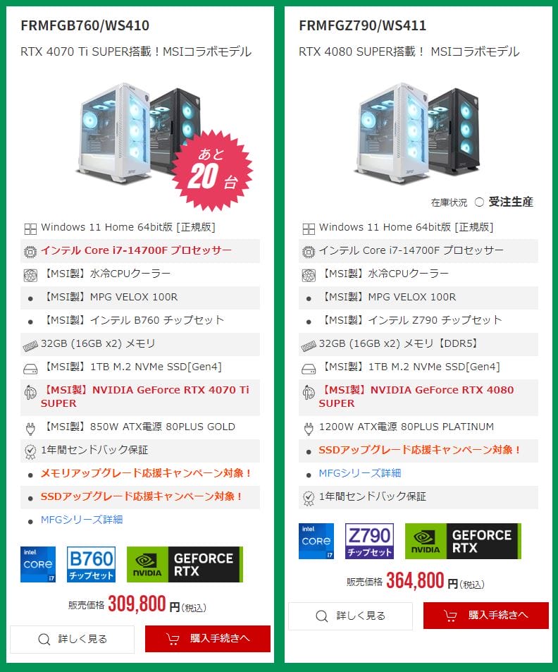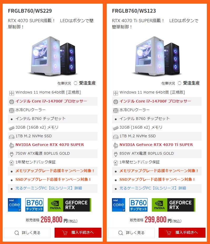 特に最新グラボの『RTX 4070Ti SUPER』『RTX 4070 SUPER』を搭載したモデルが用意されている点は必見!