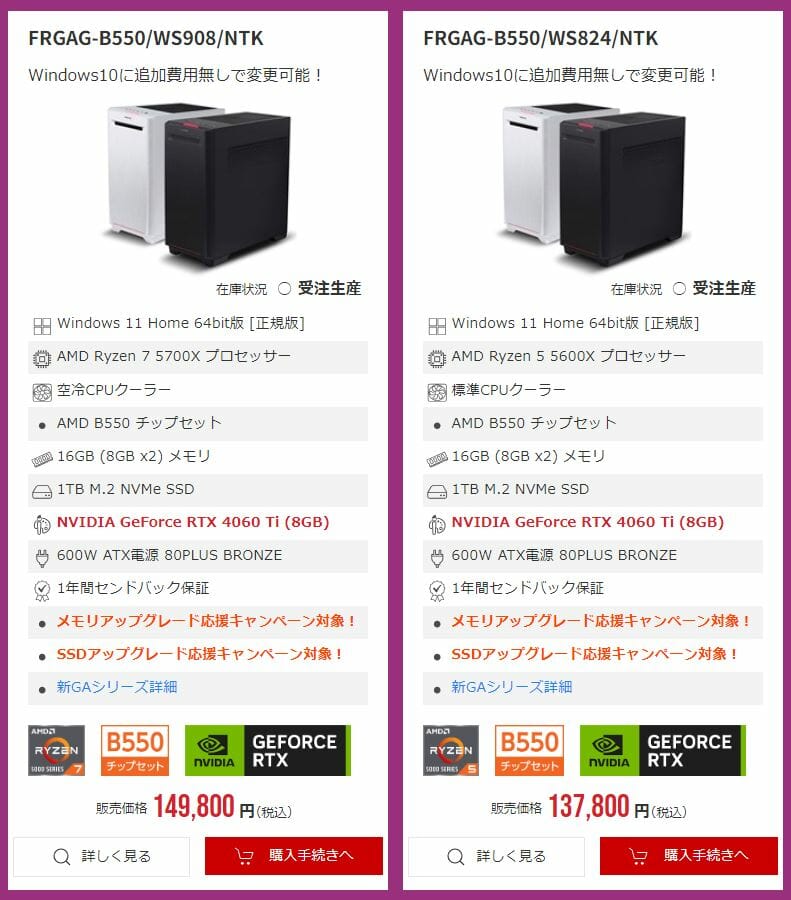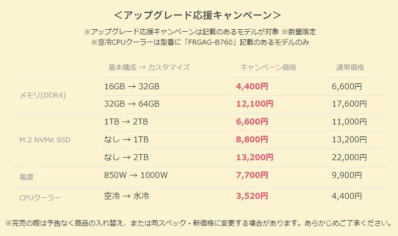なお、一部のモデルはメモリ増設&SSD&電源カスタマイズの割引キャンペーン対象となっています。