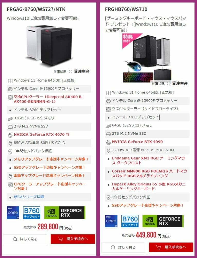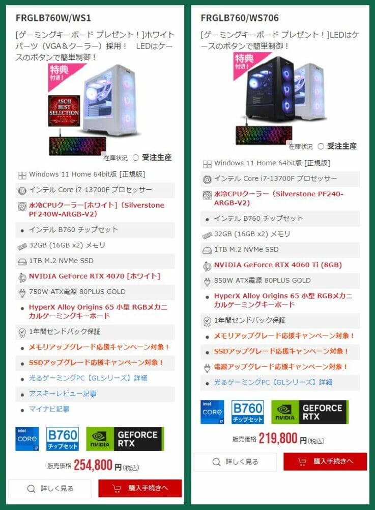 ▼第13世代Core i7+RTX4070Ti搭載モデルは、なんと税込25万円台という特価で販売中!しかもゲーミングキーボードがプレゼントされます。