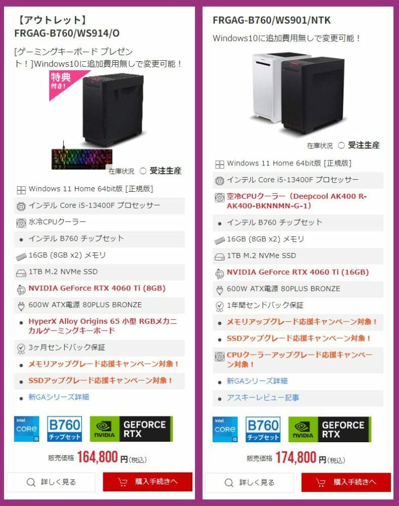 ▼RTX4060Ti+第13世代Core i5搭載モデルが、税込17万円台の大特価に。