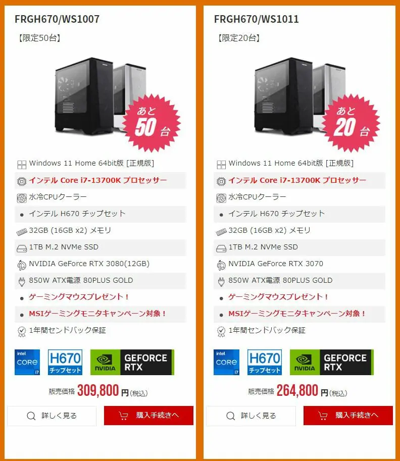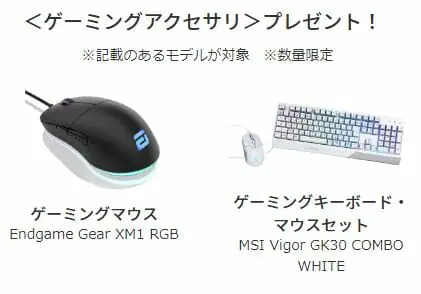 また、一部のモデルはゲーミングアクセサリのプレゼントや、CPUクーラー&モニタをお得にカスタマイズできるキャンペーンの対象となっています。