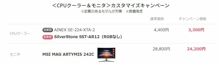 また、一部のモデルはCPUクーラー&モニタをお得にカスタマイズできるキャンペーンの対象となっています。
