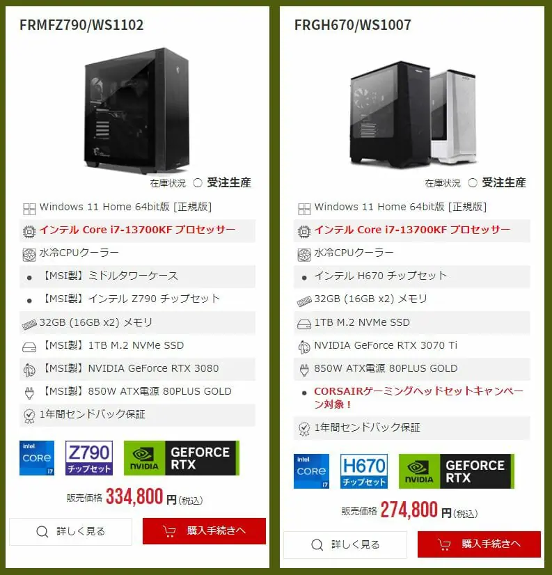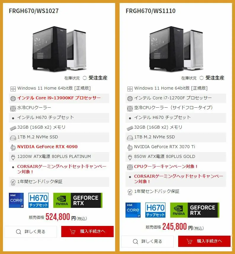 最新のRTX4090や第13世代Core CPU搭載モデルがラインナップに並んでいる点も要注目。