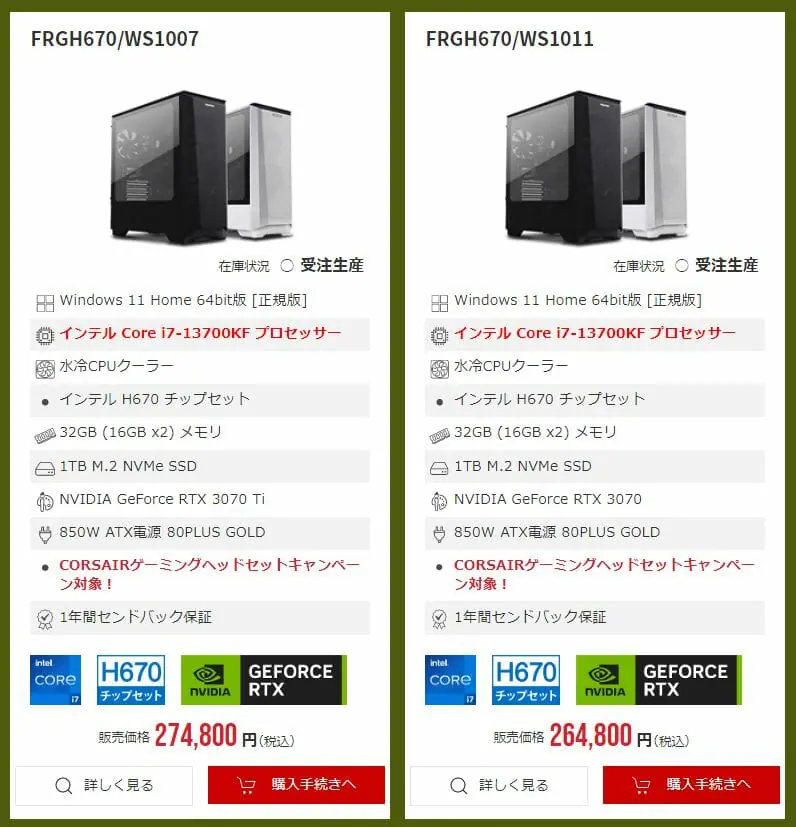 ▼第13世代Core i7+RTX3070Ti搭載のハイエンドゲーミングPCを税込27万円台で購入可能。