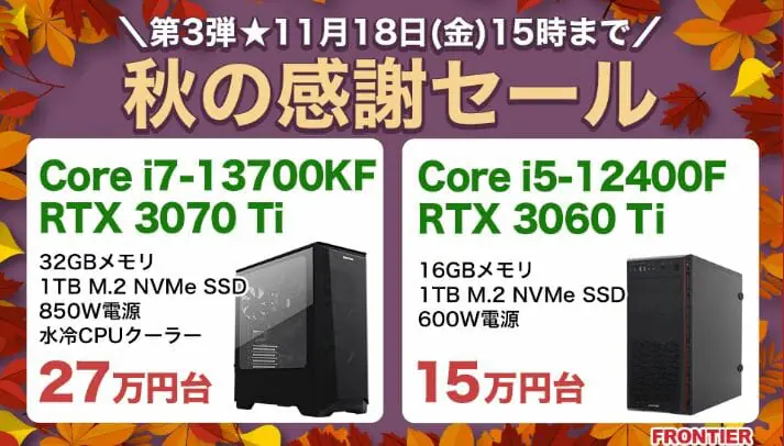 今回実施される『FRONTIER 秋の感謝セール第3弾』では、ハイエンド級からミドル級まで、非常に幅広い価格帯のゲーミングPCがセール対象となっています。