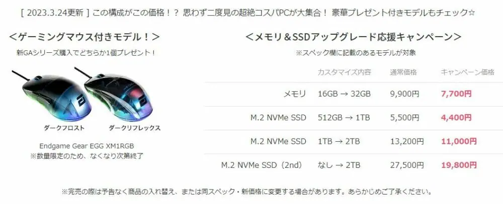 なお、ゲーミングマウスがプレゼントされる対象モデルが用意されていたり、お得にメモリ&SSDの増設カスタマイズが可能なキャンペーンも実施されています。