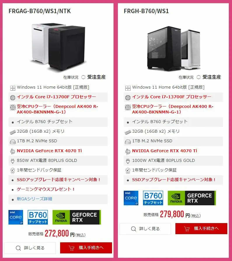 最新のRTX4070Ti搭載モデルがラインナップに並んでいる点も要注目。