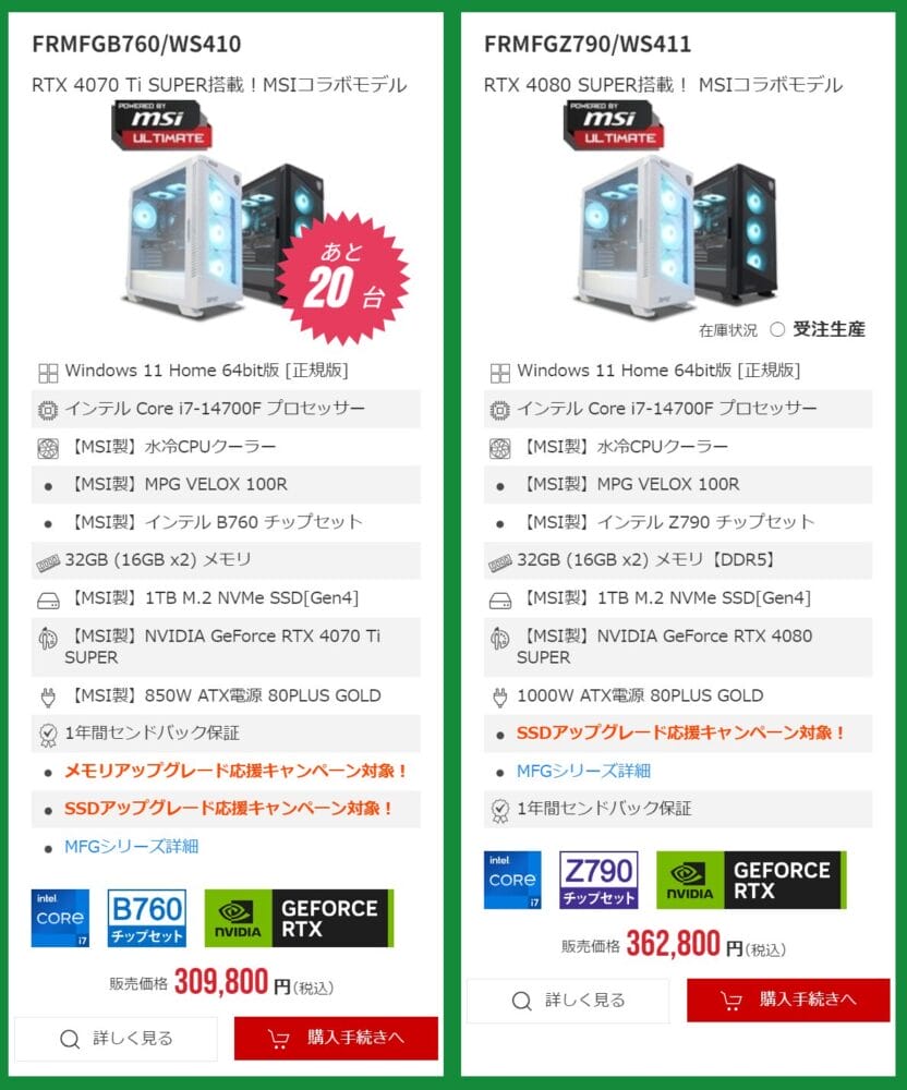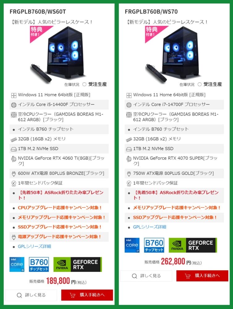 同じく最新グラボである『GeForce RTX 4070Ti SUPER』『GeForce RTX 4070 SUPER』搭載モデルもラインナップに含まれています。