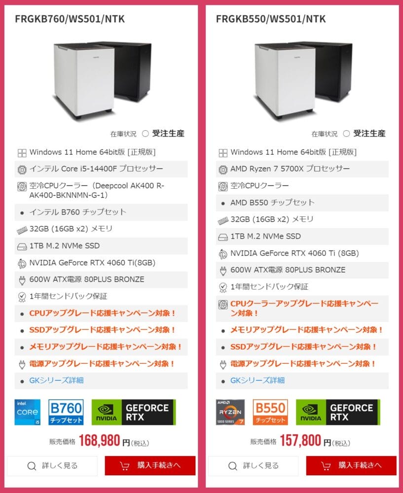 そのほか、第14世代Core CPUと『RTX4070』『RTX4060Ti』や『RTX4060』などを搭載したお得なミドルレンジモデルも、さらにお得な価格で販売されています。