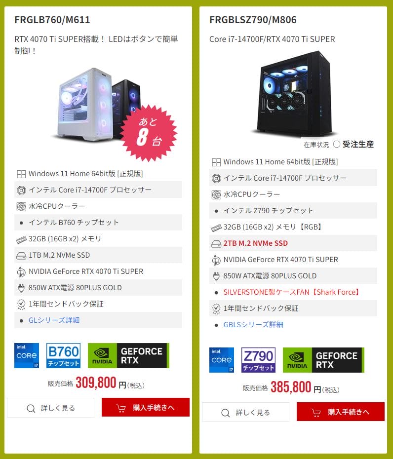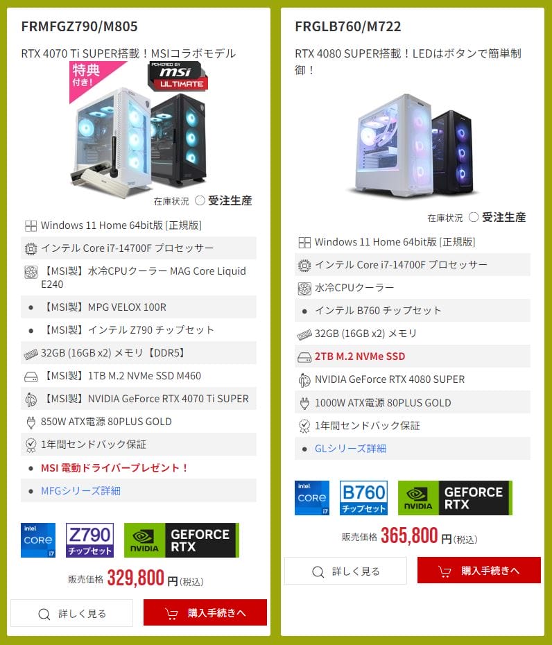 ▼「RTX 4070Ti SUPER」や「RTX 4070 SUPER」を搭載したモデルも大特価!リーズナブルなエントリーモデルも、さらにお得な価格になっています。