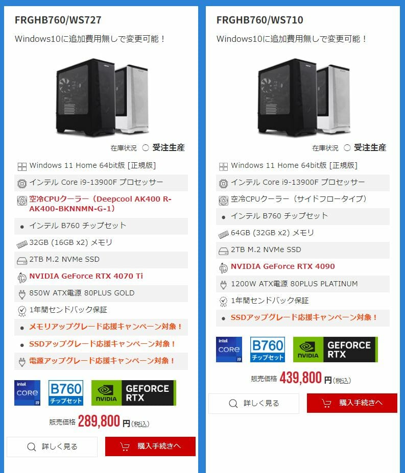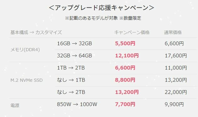 なお、一部のモデルはメモリ増設&SSD&電源カスタマイズの割引キャンペーン対象となっています。