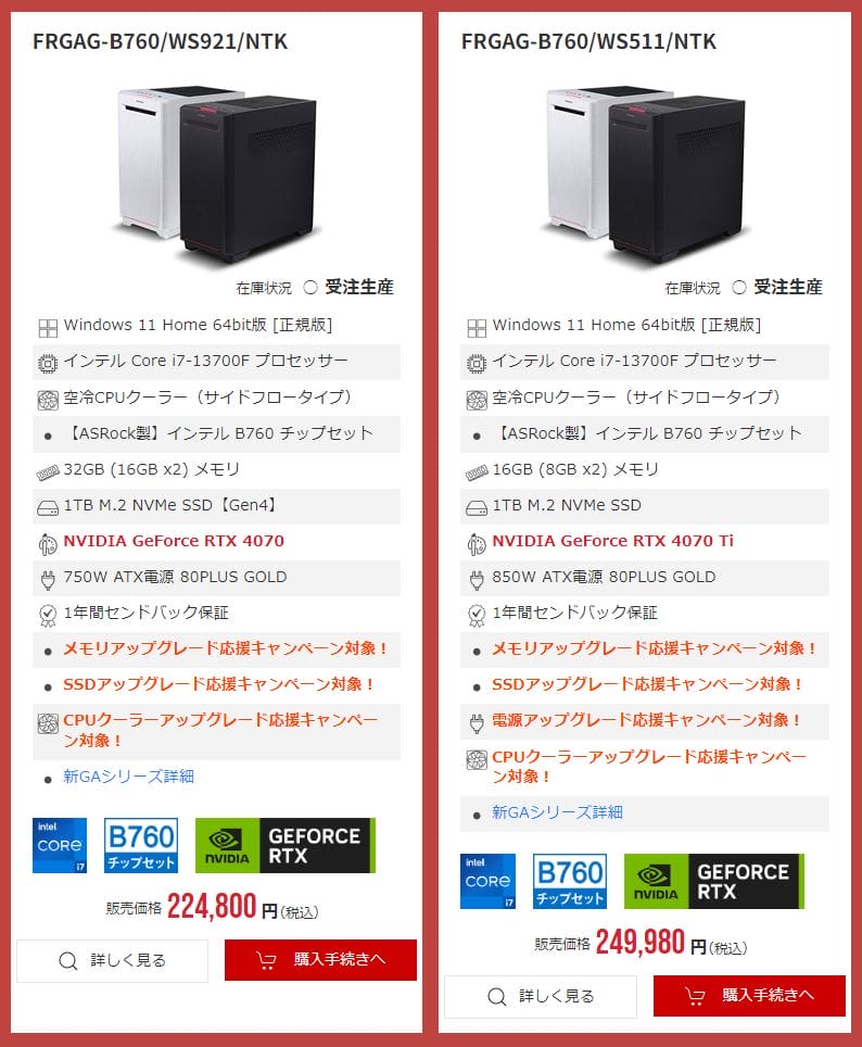 その他『RTX4060Ti』などを搭載したミドルレンジモデルも、さらにお得な価格で販売されています。