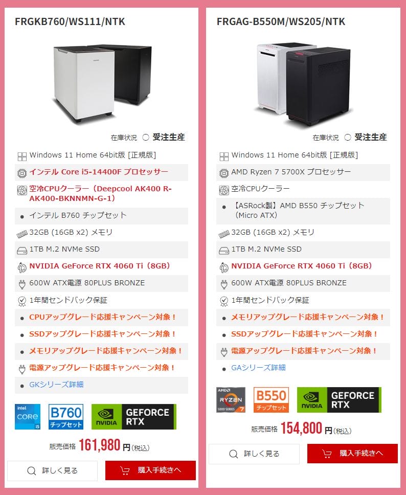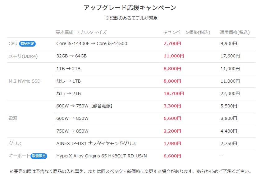 なお、一部のモデルはメモリ増設、SSD、電源カスタマイズ等の割引キャンペーン対象となっています。グリスやマイクを割引価格で追加できる特典もアリ。