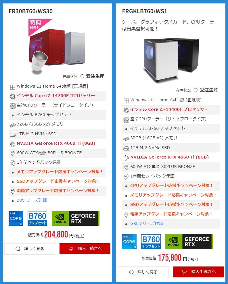 そのほか、第14世代Core CPUと『RTX4070』『RTX4060Ti』や『RTX4060』などを搭載したお得なミドルレンジモデルも、さらにお得な価格で販売されています。