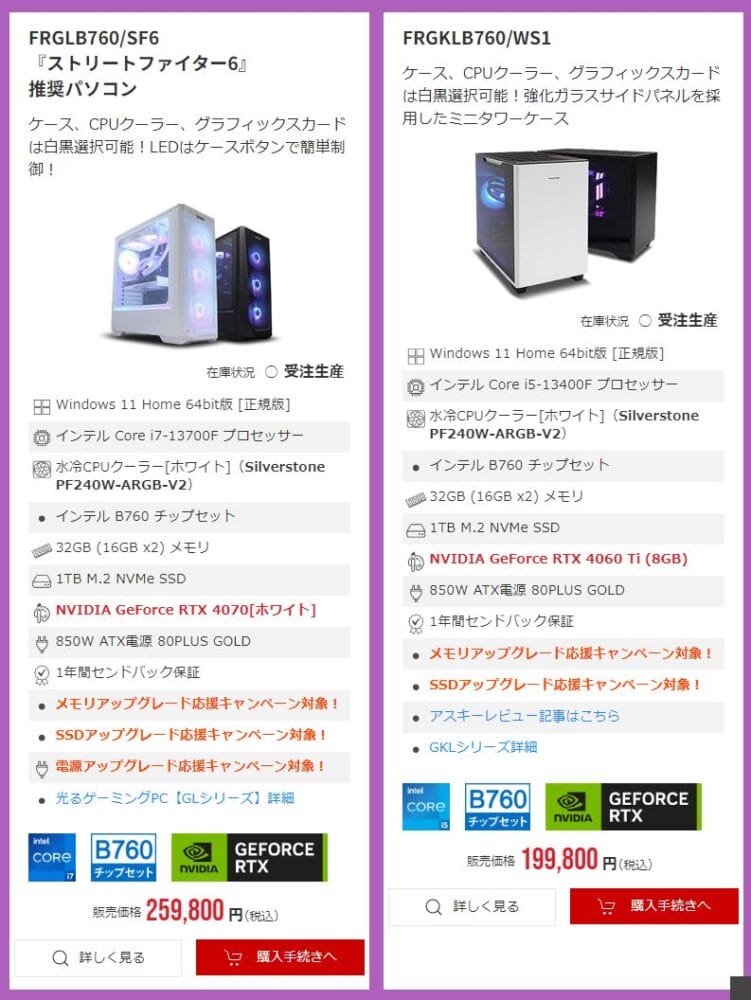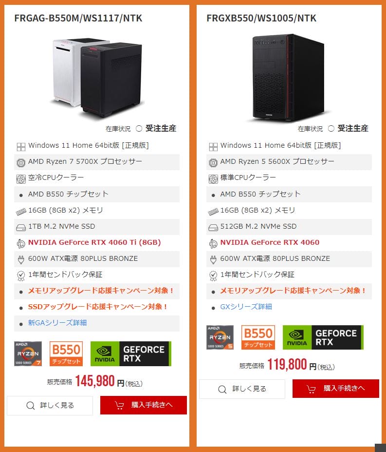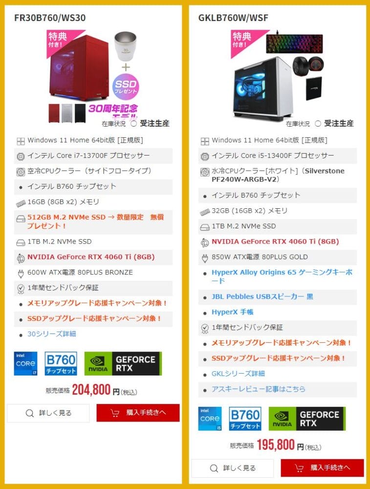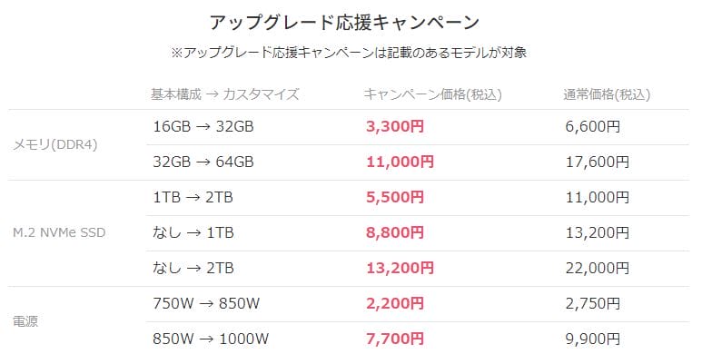なお、一部のモデルはメモリ増設&SSD&電源カスタマイズの割引キャンペーン対象となっています。