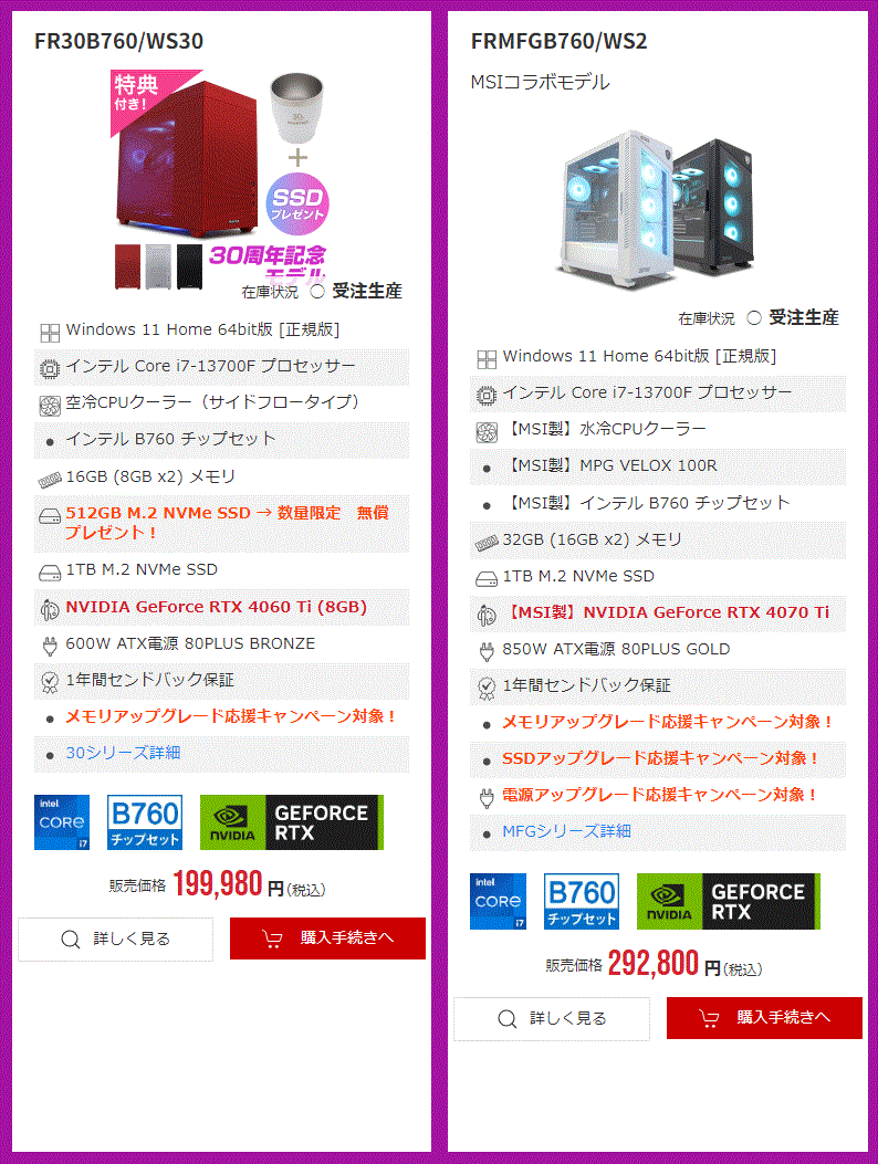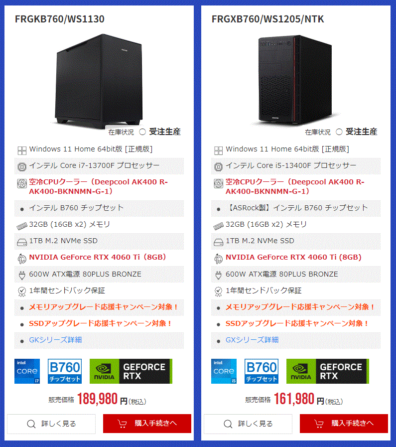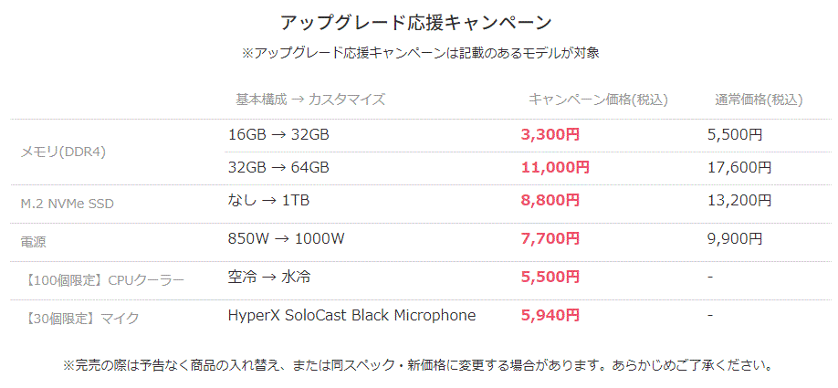 なお、一部のモデルはメモリ増設&SSD&電源カスタマイズの割引キャンペーン対象となっています。