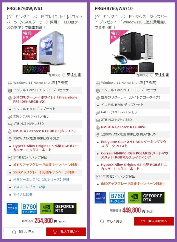 今回実施される『30周年直前SPECIALセール』では、ハイエンド級からミドル級まで、非常に幅広い価格帯のゲーミングPCがセール対象となっています。