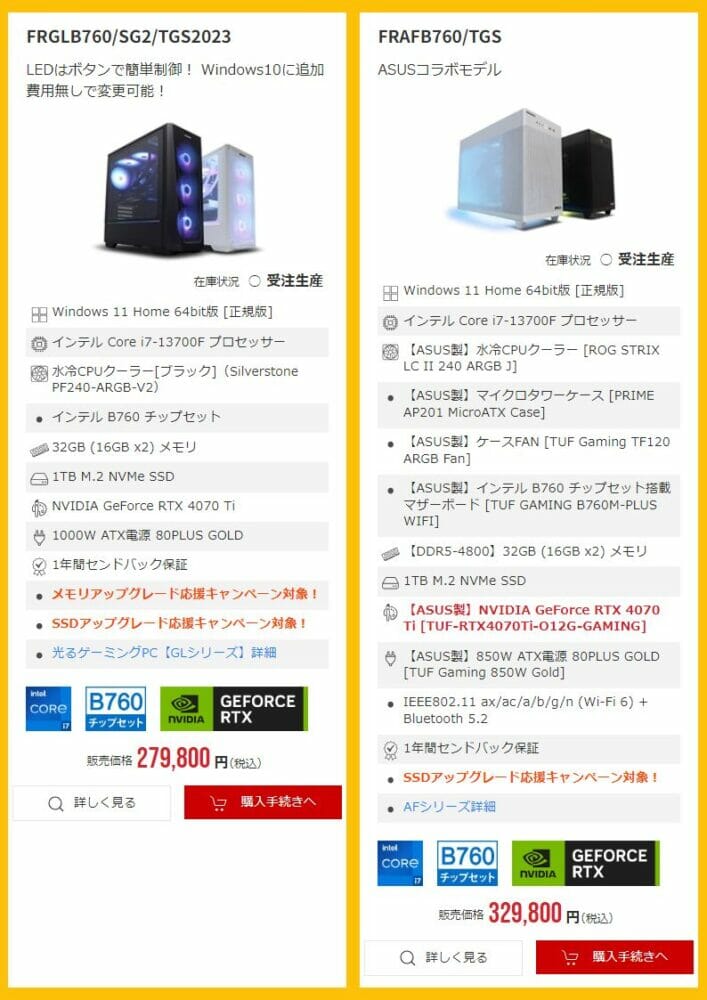 ▼第13世代Core i7+RTX4070搭載モデルは、なんと税込21万円台という特価で販売中!