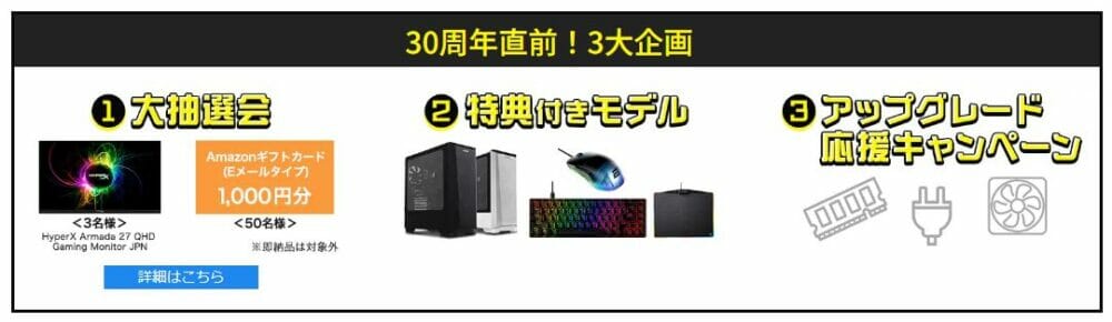 同サイトにおいて、ハイエンドゲーミングPCをお得な割引価格で購入できる『30周年直前SPECIALセール』が開催されます。