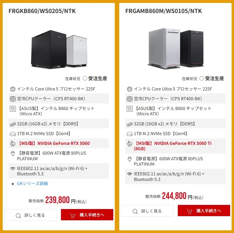 Core Ultra 5 プロセッサー 225Fと『【MSI製】NVIDIA GeForce RTX 5060Ti (8GB)』を搭載しており、RAMも32GB用意。ゲーミングからクリエイティブ用途にまで活用可能なスペックを備えています。
