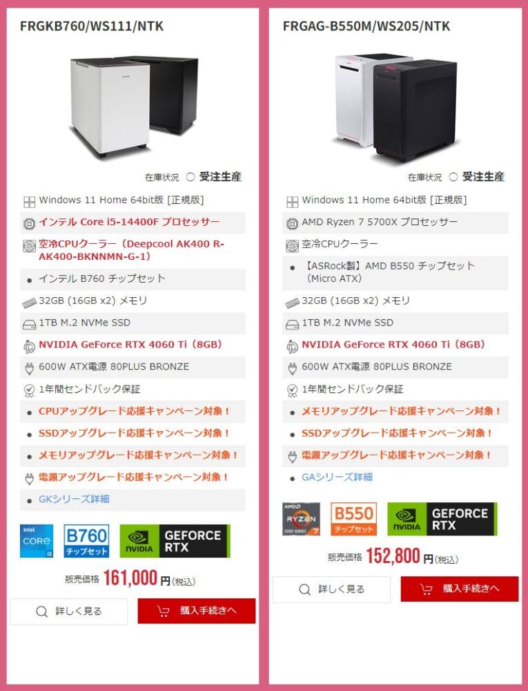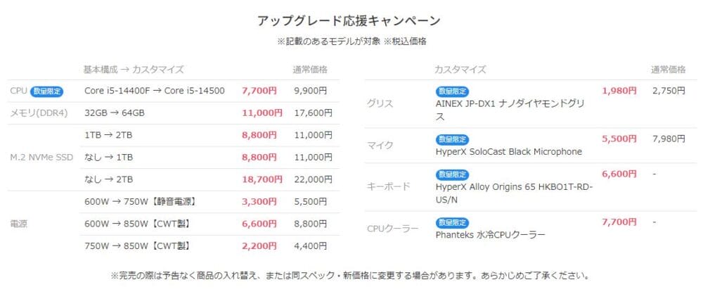 なお、一部のモデルはメモリ増設、SSD、電源カスタマイズ等の割引キャンペーン対象となっています。グリスやマイクを割引価格で追加できる特典もアリ。