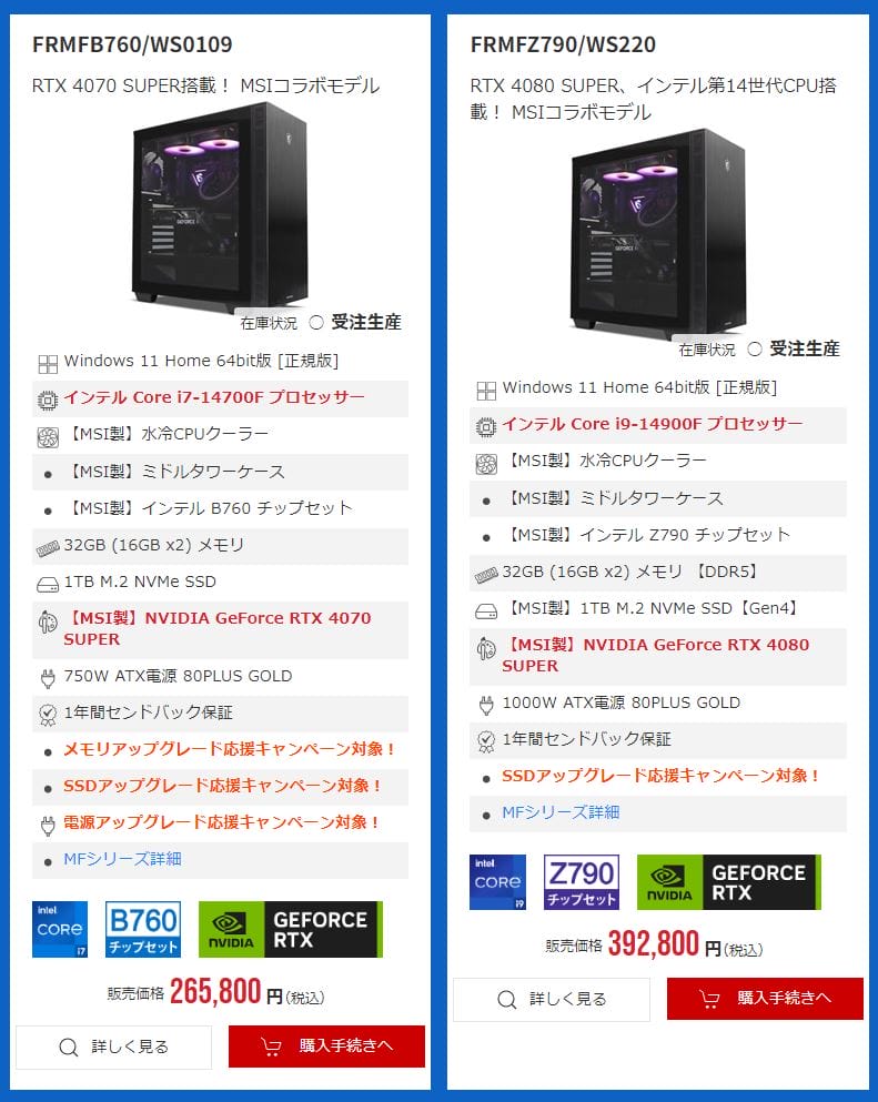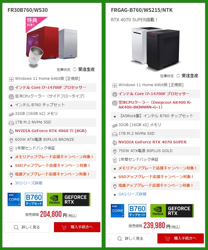 同じく最新グラボである『GeForce RTX 4070Ti SUPER』や『GeForce RTX 4070 SUPER』搭載モデルもラインナップに含まれています。