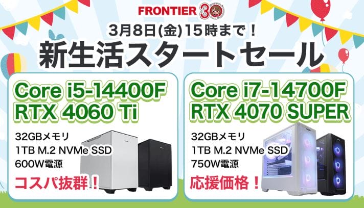 RTX 4070Ti SUPER搭載ゲーミングPCが大特価!フロンティア『30周年記念SALE FINAL』開催