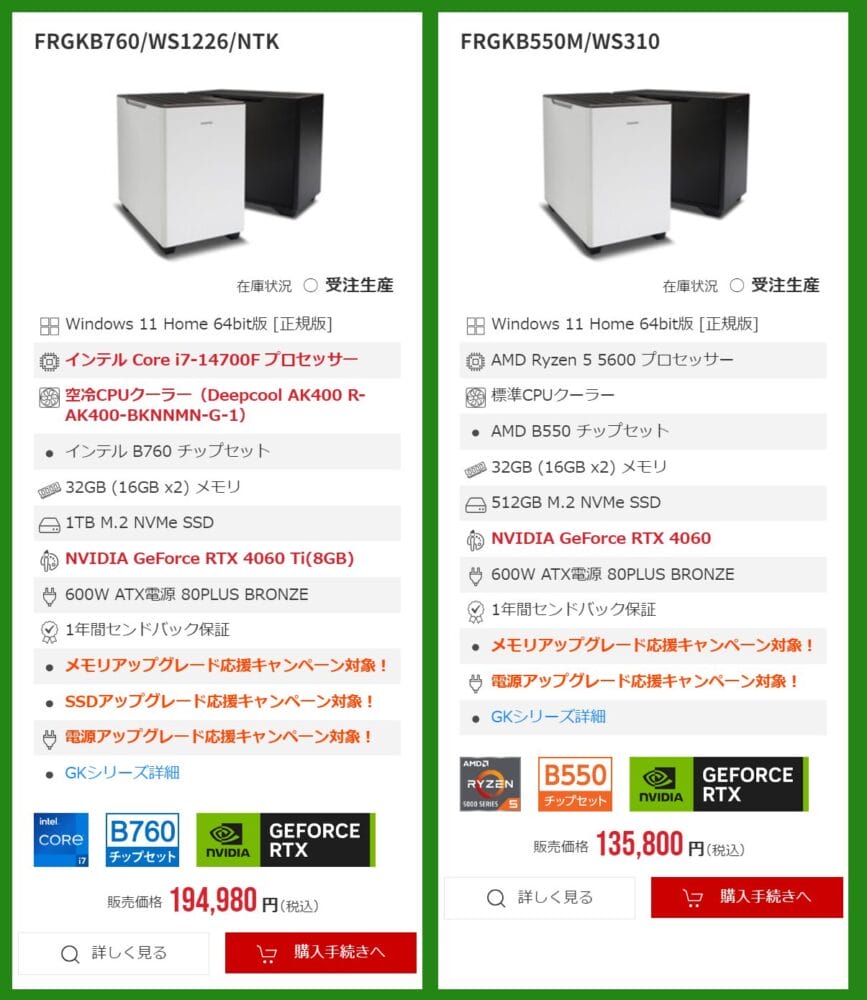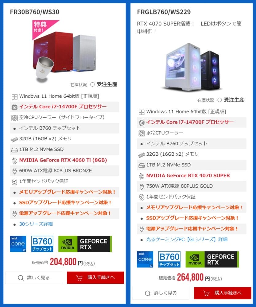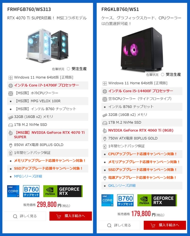 そのほか、第14世代Core CPUと『RTX4070』『RTX4060Ti』や『RTX4060』などを搭載したお得なミドルレンジモデルも、さらにお得な価格で販売されています。