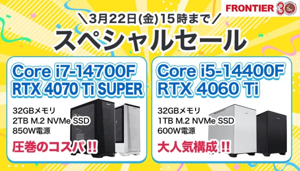 RTX 4070Ti SUPER搭載ゲーミングPCが大特価!フロンティア『30周年記念SALE FINAL』開催