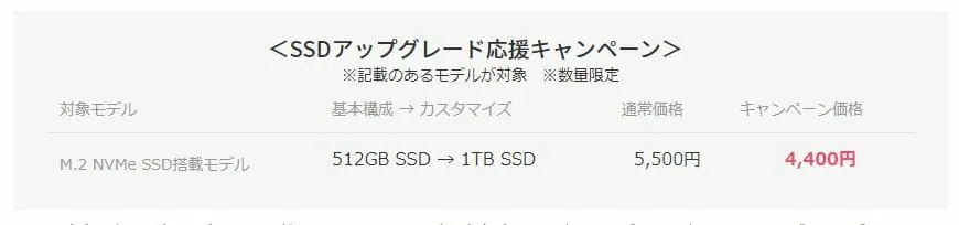 なお、お得にSSDの増設カスタマイズが可能なキャンペーンも実施されています。