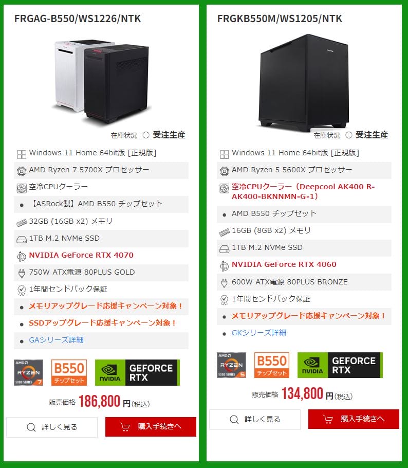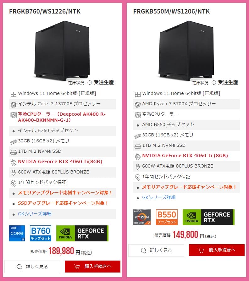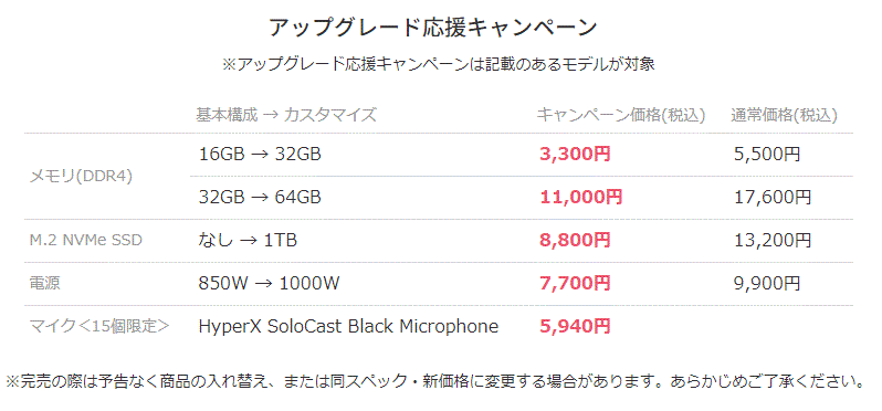 なお、一部のモデルはメモリ増設&SSD&電源カスタマイズの割引キャンペーン対象となっています。