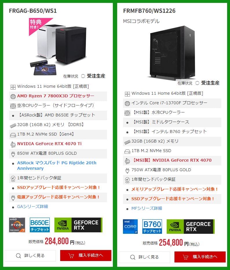 その他『RTX4060Ti』や『RTX4060』などを搭載したミドルレンジモデルも、さらにお得な価格で販売されています。