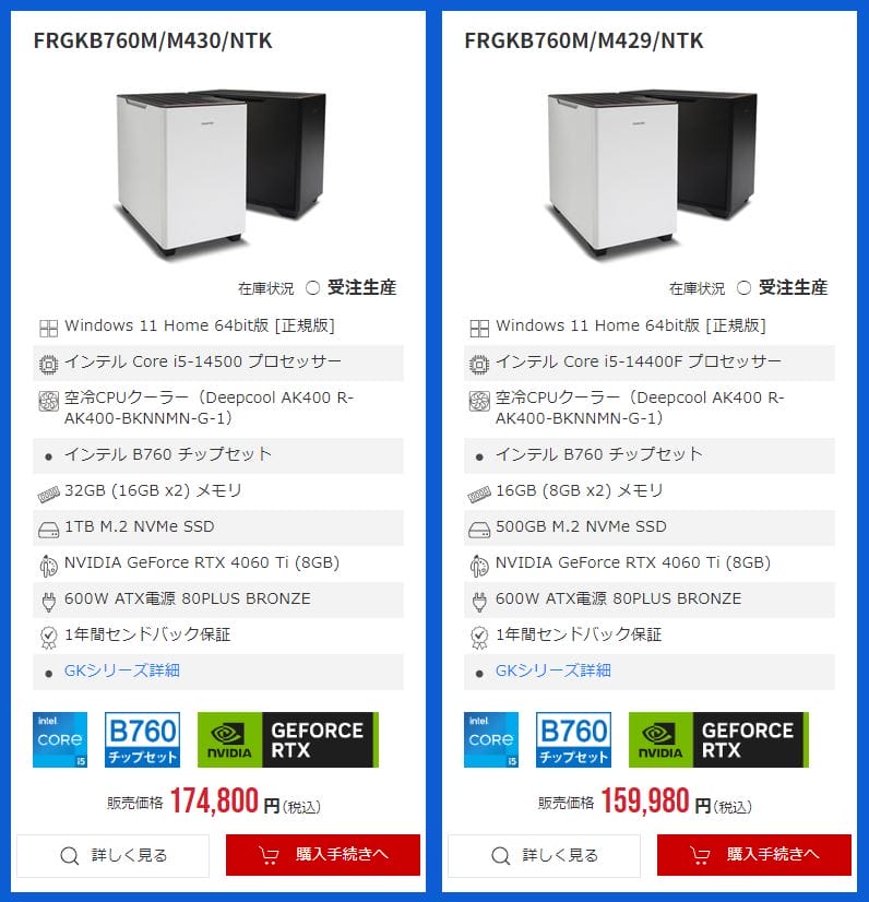 第14世代のCore i7、および『RTX4060Ti』を搭載したミドルハイ級のゲーミングPCです。