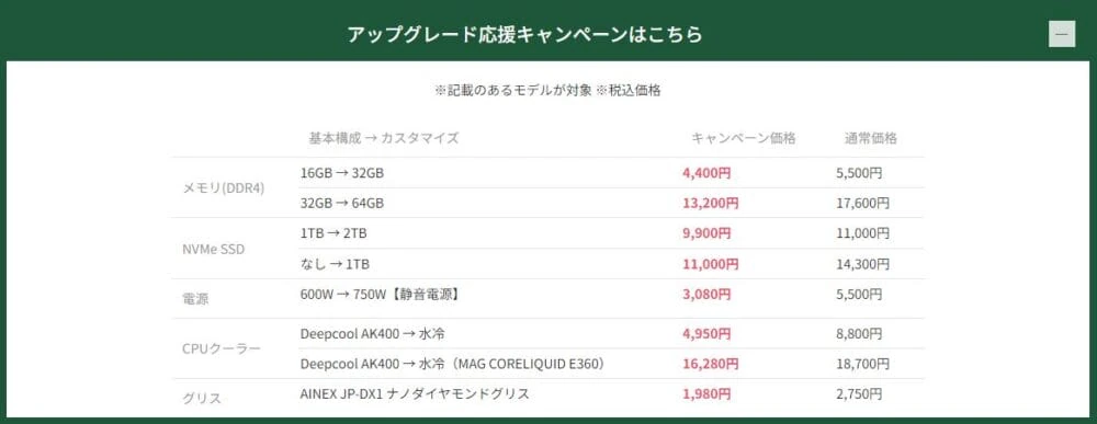 なお、一部のモデルはメモリ増設、SSD、電源カスタマイズ等の割引キャンペーン対象となっています。Officeソフトやゲーミングヘッドセットも割引対象です!