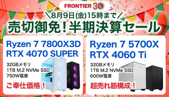今回実施される『売切御免!半期決算セール』では、ハイエンド級からミドル級まで、非常に幅広い価格帯のゲーミングPCがセール対象となっています。