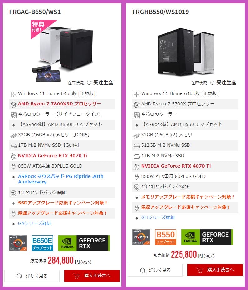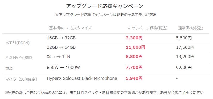 なお、一部のモデルはメモリ増設&SSD&電源カスタマイズの割引キャンペーン対象となっています。
