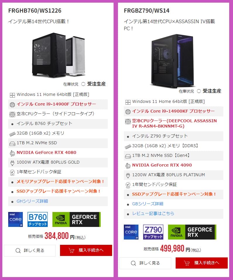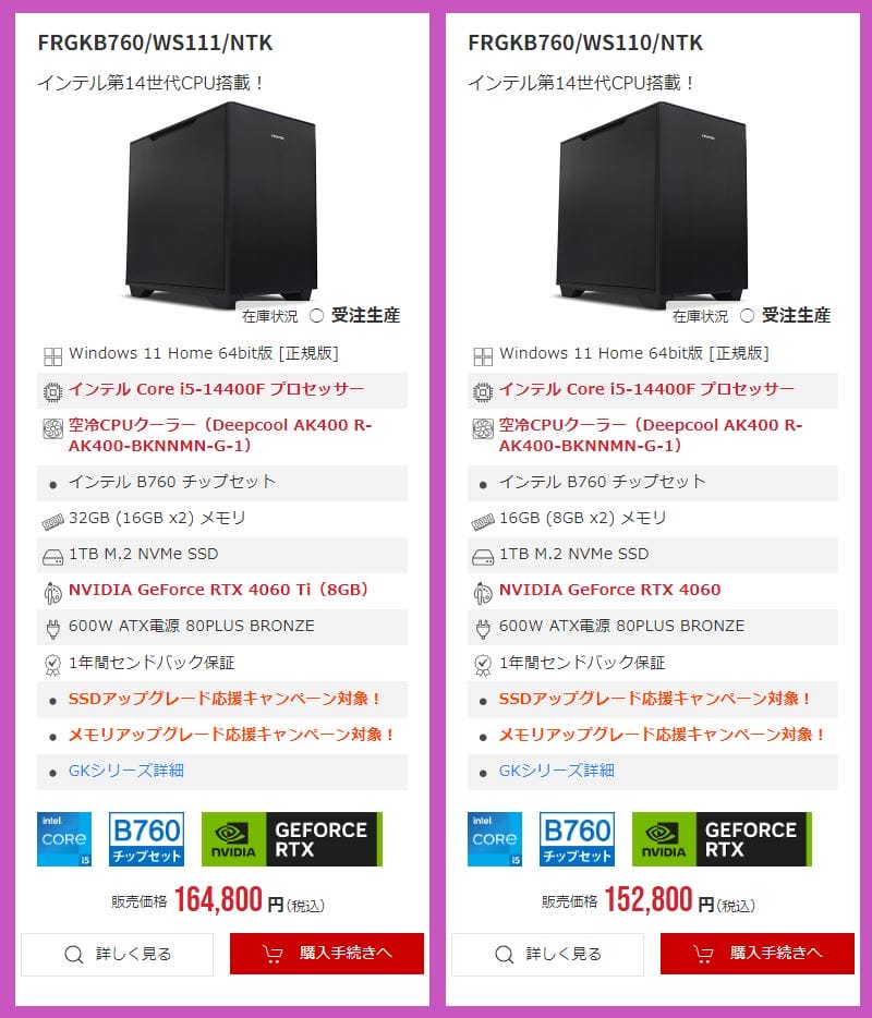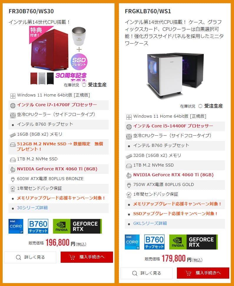 そのほか、第14世代Core CPUと『RTX4060Ti』や『RTX4060』などを搭載したお得なミドルレンジモデルも、さらにお得な価格で販売されています。