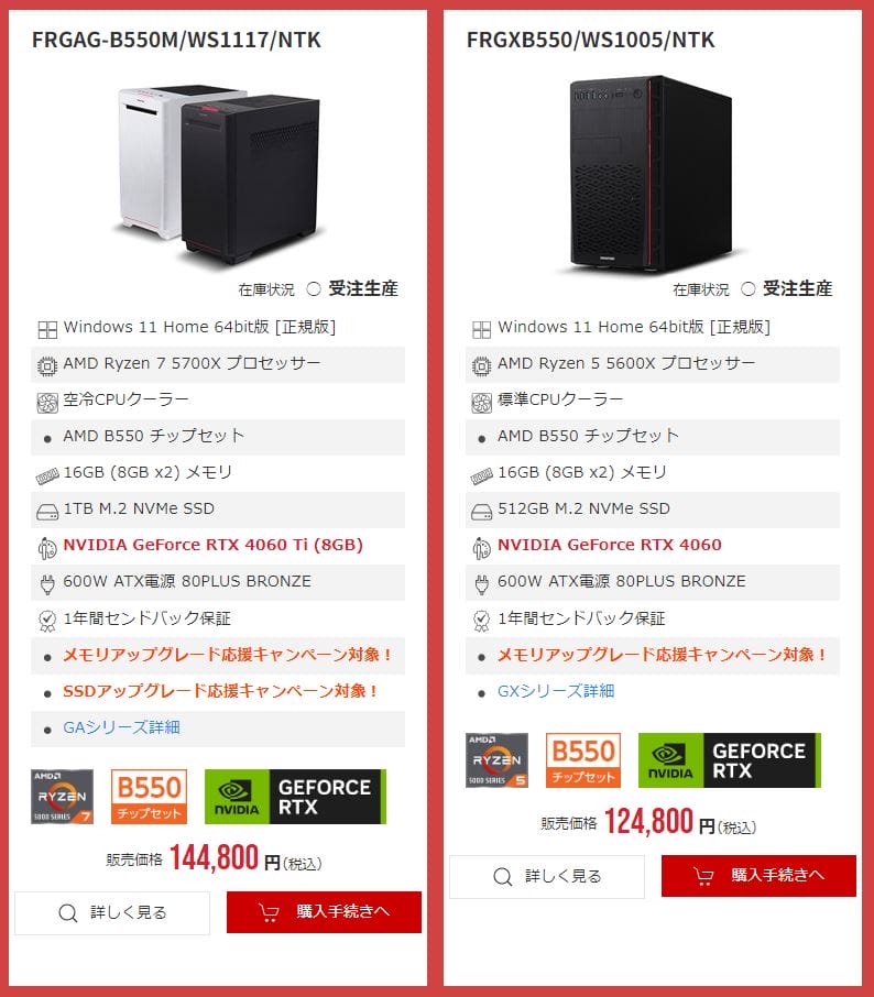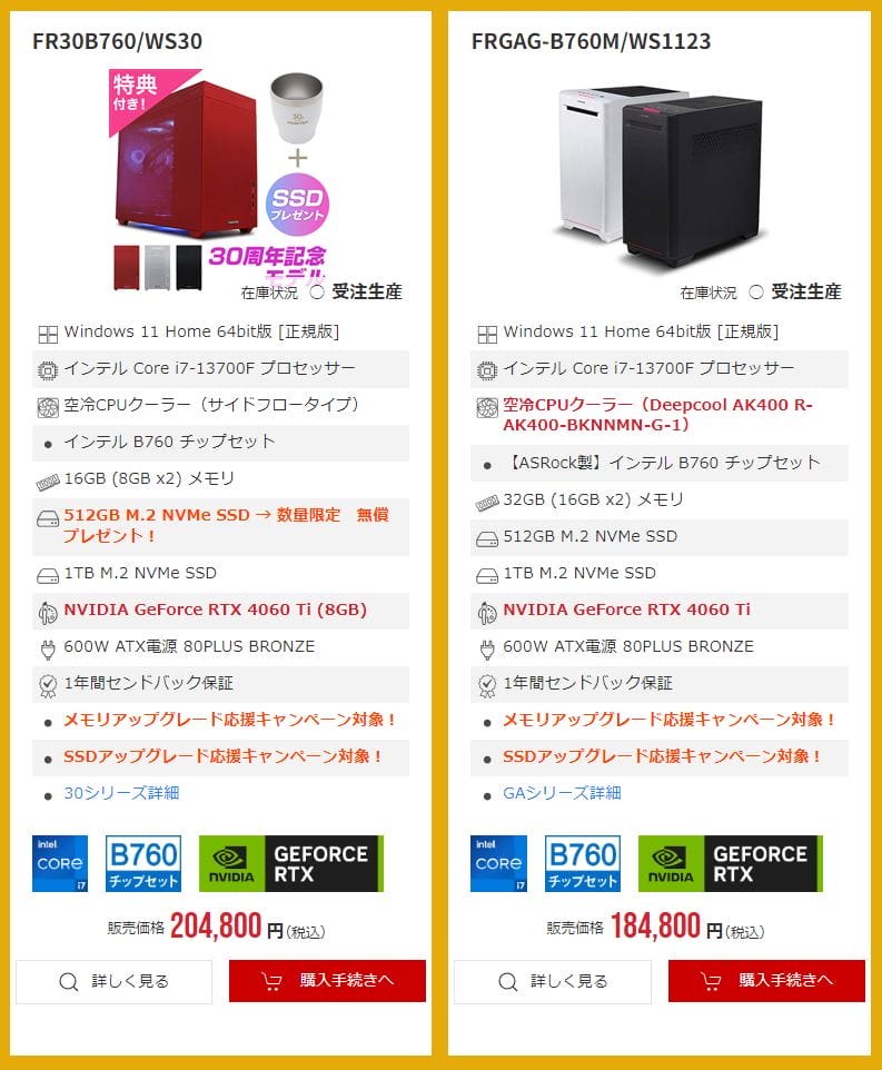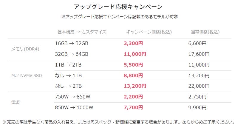 なお、一部のモデルはメモリ増設&SSD&電源カスタマイズの割引キャンペーン対象となっています。