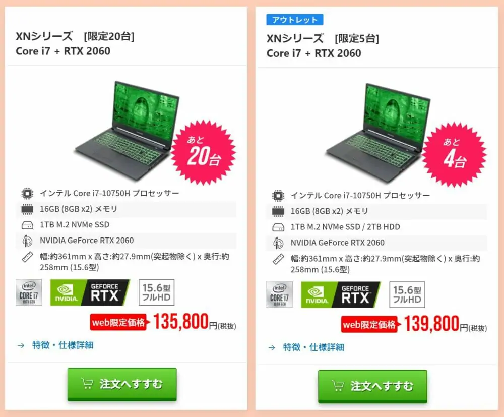 ▼RTX2060を搭載したゲーミングノートPCも15万円ほどの価格に。通常時よりも数万円の割引が適用されています。