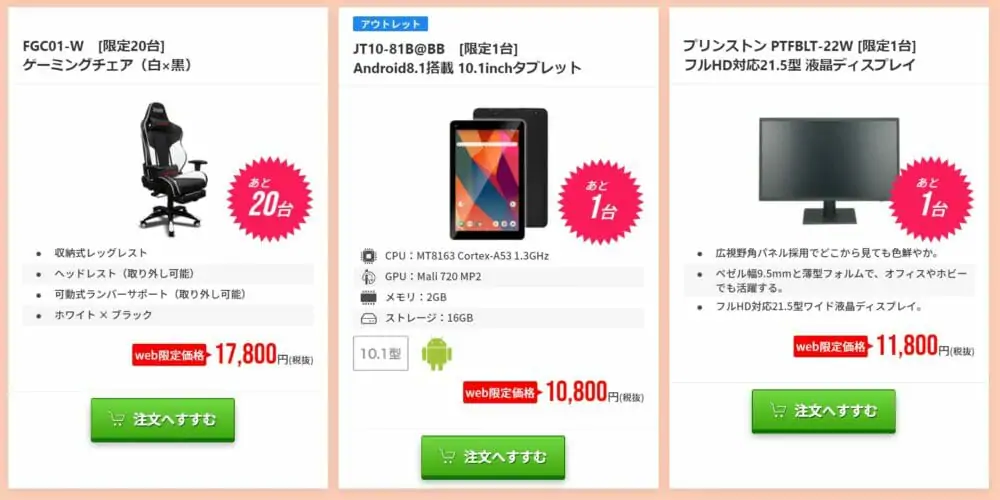 ただし、対象製品はいずれも数量限定となっており、販売定数に達し次第セールが終了となってしまいます。