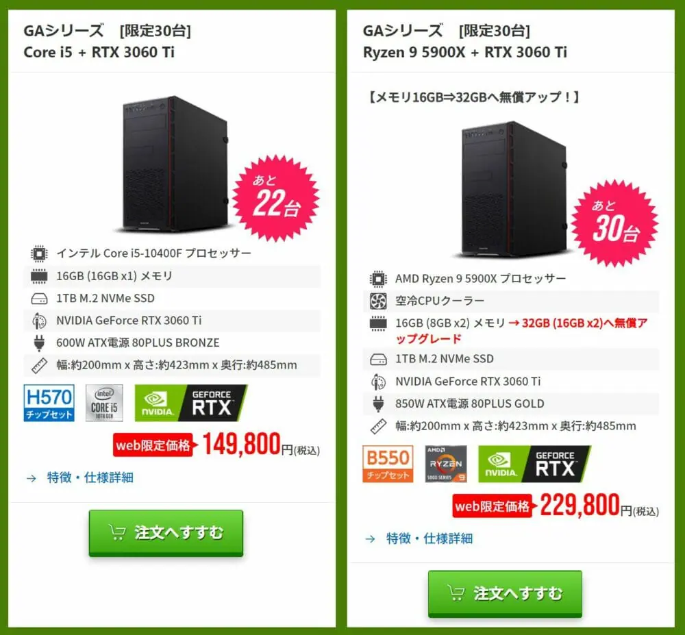 ▼『RTX3060Ti』を搭載したミドルハイ級のモデルも、更にお買い得価格となっています。こちらもメモリの無償アップグレード特典付き。