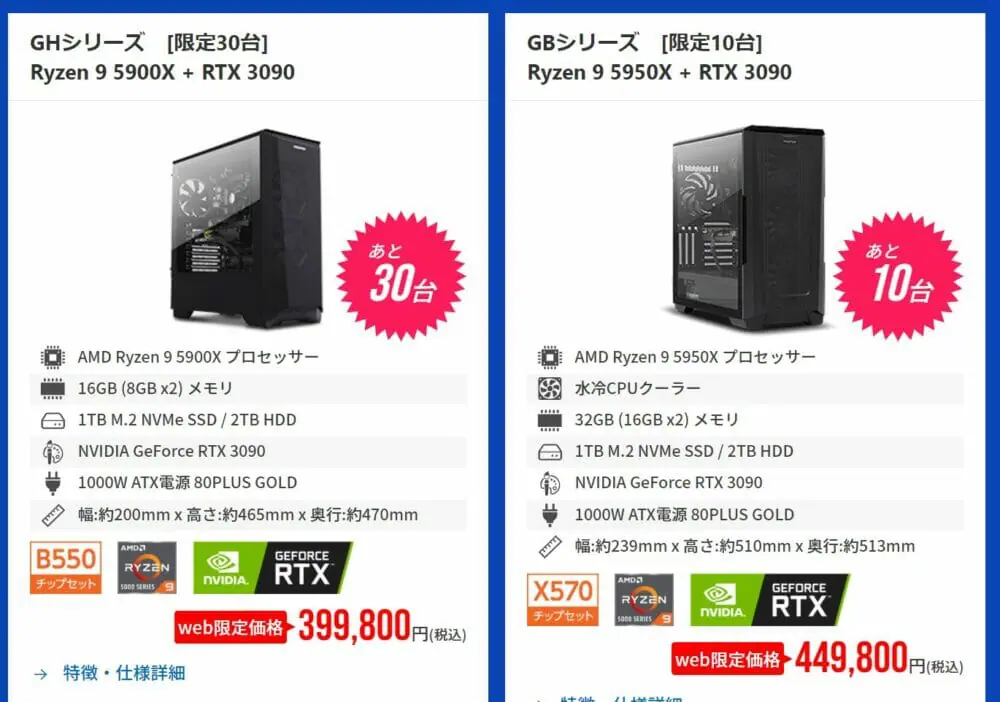 ▼最高級グラフィックボードであるRTX3090を搭載したモデルについても大幅割引価格で購入することが可能です。